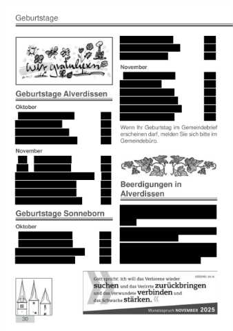 Geburtstage November Geburtstage Alverdissen Oktober Wenn Ihr Geburtstag im Gemeindebrief erscheinen darf, melden Sie sich bitte im Gemeindebüro. November Beerdigungen in Alverdissen Geburtstage Sonneborn Oktober 30